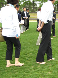 また、ちょうど通路と園庭の境目に足跡サイズで芝がないところの土を触りながら、「今見ると、ここだけ荒れた土ですが、1年前までは、ここも、その土の園庭でした」と言われて、すでに芝生の園庭が当たり前になっていた(良さを実感していた)私たち参加者は、感慨を新たにしました。