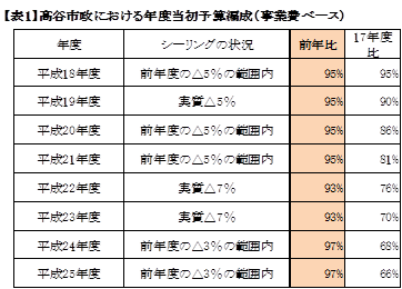 答は、表①のとおりです。髙谷市政は平均5%のマイナスシーリングを8年間続け、対象となる事業予算を9年前の3分の2まで下げてしまいました。