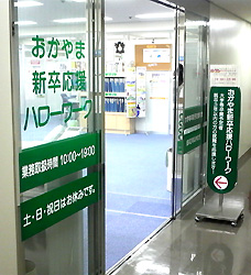 15日に、今春卒業した大学生の就職率が4月1日時点で、93.6%だったことが厚労省、文科省の調査により判明し、1996年の調査開始以降で最低だった前年から2.6%アップし、4年ぶりに改善されたと報道されたので、18日(金)おかやま新卒応援ハローワークに行って、担当者に話しを伺ってきました。