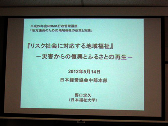 平成24年度NOMA行政管理講座に名古屋へ出かけました。テーマは「地域福祉」。講師は日本福祉大学社会福祉学部教授 野口定久氏。