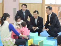 訪問している間、何組もの親子が独歩にむけて指導員にサポートを受けていました(赤ちゃん体操と呼ばれています。ダウン症のお子さんは歩行もしゃべりも一般的な平均よりも遅れがちです。それは体と脳の関係において、独歩できることとしゃべることがつながっているからだそうです。ダウン症に限らず歩けるようになったらしゃべれる(歩けるようにならないとしゃべれない)、そんな願い(目標)に向けたお母さんの優しくも真剣な表情に接し、福祉の充実を決意した視察となりました。