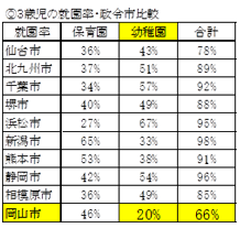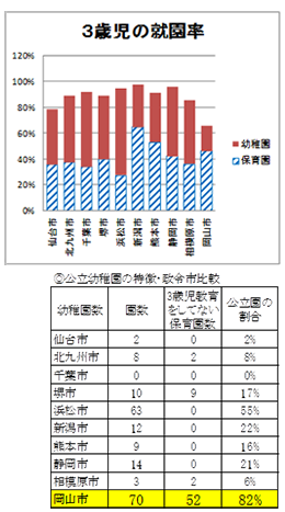 11月議会個人質問大森市長就任後、初となる本格的な論戦が行われました。「子育て」・「子育ち」に絞った私の個人質問の概略を以下お知らせいたします。 ◆岡山市の活力と未来のための最優先施策保育園に空きがないという理由で、岡山市でも多くの女性が仕事を辞め、そして同様の理由で出産後の復職や再就職を諦めています。 ◆あとどれだけ保育を充実すれば良いか。![]() 岡山市が行ったアンケート調査や総務省統計局「労働力調査」のデータから、今より4500人分の受け皿整備が必要です(データ処理は私が行いました)。 ◆整備にはスピードが求められています。岡山市は公立園が多いという特異なまちです。そこで単に保育定数を増やすだけではなく、今後の財政上の負担や、幼稚園の空き教室といった無駄をより抜本的に見直すため、かなり壮大な改革を行う考えです。方向は私も支持していますが、今の手順では小回りが利かずスピードが求められている「保育ニーズ」に応えられません。団塊ジュニアの子どもたちの多くが小学校に上がってしまうのは遠い先の話ではありません。早急な解決策こそが必要なのです。 ◆既存の施設と仕組みを活用すべき。![]() 本市特有の資産である公立幼稚園に着目し、「3歳児教育」と「預かり保育」を最優先施策とするよう市長に提案しました。以下がその理由です。