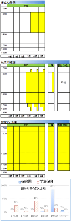 6月議会では、「就学前の保育と就学後の保育(学童保育)をどう充実すれば、市民の願いに応えられるのか」を議論しました。 来年度から「子ども・子育て支援新制度」がスタートします。岡山市は、預けたいときに希望の園に入れたらいいな」という願いには、「保留児童解消を目指します」、市立幼稚園に通わせているけど午後も預かってほしいな。3年保育が増えたらいいな」には、「幼保連携型認定こどもならできる!」と、答えていますが、スケジュールを明かさないため、総論としての期待とは裏腹に、各論としての不安が募っています。特に保留児童の多いエリアはなおさらです。 ◆保留児童の解消「29年度には解消となる事業計画を策定する」という答弁でした。ただ、保育のニーズは、整備が進むにつれ、あとからあとから湧いて出てきます。これを「いたちごっこ」と捉えるのか、「岡山市で子どもを産み育てる世帯が増えてくれてうれしい、ありがとう」と感謝するかで、行政の対応はまったく違ってきます。岡山市の未来を創生する事業として取り組むよう求めました。 ◆幼保連携型認定こども園右の資料のとおり、幼稚園の受け入れ時間帯の格差は明らかです。特に3歳児は象徴的です。しかも岡山市は市立幼稚園が多い、特異な政令市なのです。 どうすべきか。「新しい幼保連携型認定こども園の導入により、0歳から就学前の子どもの保護者のニーズに最大限に応えていきます」と、岡山市は言います。 ならば一刻も早く、優れものの認定こども園に移行すべきです。 ◆小1の壁5歳児の保育園就園率(46.1%)と、小学校1年生の放課後児童クラブ登録率(27.8%)を比較すると、保育園利用者の4割が消えていることがわかります。 なぜでしょう。保育園と学童保育の預かり時間を比べてみると、認可保育園の88%が19時までなのに対し、学童保育は18時が42%で最も多く、次に多いのは17 時の26%です。 また、土曜日は、認可保育園はいずれも預かりますが、学童保育では、預かりなしのクラブが73%もあります。 そこで、これらのデータと、岡山市が実施した放課後児童クラブのニーズ調査とを突き合わせてみました。 小学校1年生の子どもを持つ共働き世帯の場合、平日利用には、18時より遅い終了時間を希望、または、土曜日の利用を希望する世帯は52.5%と半数を超えています。 明らかに、ここに課題があります。岡山市は、「どのクラブでも基本的に同じサービスが受けられるように取り組んでいきます」と、表明していますが、27年度のスタートでの統一を想定して準備してきませんでした。急がせます。