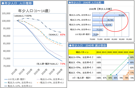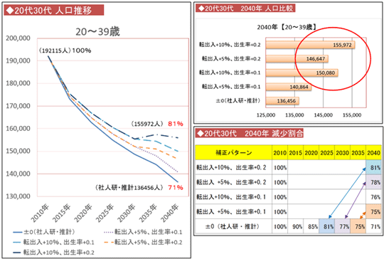 次に年少人口です。2010年には10万人でしたが、2040年には7万3千人(73%)になるとの推計が出ています。これに、補正ファクターを加えると、一番上位の値は9万2千人で2010年の92%に止まります。 人口比較のグラフでは、やはり3つのパターンで1万人から2万人の上昇がみられます。 そして減少割合では、20代30代よりも補正の影響が大きくでて、3つの補正パターンでは77%から92%となります。これは、30年間の時計の針を、5年から20年遅らせる可能性を示しています。人口減少を、かなりスローダウンできるということです。 また、年少人口、20~30代とも、出生率の補正の方が、効果が表れるのが早く、30年間トータルでも効果が大きい値を示すことから、子育て支援への速やかで集中的な政策の投下が人口減少の抑制に効果的であるといえます。 今、就職、結婚、出産に直面する若い世代、中でも女性にスポットが当たろうとしています。女性が活躍する、自分の人生を歩むうえで、その障害になっているものを取り除く、あるいは環境を整えることで、女性の自発性を引き出すのが政治や行政の役割です。 転入・転出や出生率の値は、そうした施策で岡山市がより評価された結果手に入ります。取り組む以上、万人単位での成果を期待したいところです。 ただ、今回、私が試算に使った補正ファクターは限定的ですし、その補正幅も統計的には十分ではありません。それでも一定の参考値になったものと思っていますが、やはり市として、次の総合計画に向けて、もっと本格的でしっかりとした推計を行うよう、そして、今後、検討する「新たな総合計画」の策定にあたって、人口や出生率を推計として示すのではなく、目指す成果として定めることを検討するよう求めました。