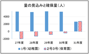 11月議会個人質問11月議会では、大森市長から、「竹之内議員のライフワーク」と評していただいた、いわば「定番」の質問項目を、新しいデータや情報を根拠として議論しました。以下、その概要を報告いたします。 ◆保育の受け皿不足は早期に解消できるのか?!女性が輝く社会に向けて舵が切られ 始めましたが、岡山市が速やかに体制整備を進めることができるかどうかが気になるところです。 これまでの保育の受け皿不足の議論は、結果として保育園に入れなかった人数をベースに議論するしかありませんでした。それは、これまで何度求めても、行政は実態調査とニーズ推計を行わなかったからです。しかし国から事業計画を求められ、急転直下、担当課は調査・推計に取り組んできました。 今回、その事業計画の見込み量と確保量(案)が出てきました。それをグラフにすると次のようになります。 まず27年度を見てください。1号は幼稚園に相当します。グラフに5000を超える量が示されているのは、既にこれだけ余裕がある、あるいは無駄な状態であることを示しています。