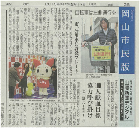 中原議員からも御報告を申し上げましたんですが,我が会派で作成した岡山市民未来創生プランが,早稲田大学マニフェスト研究所が取り組んできました第9回マニフェスト大賞に応募しましたところ,10月に優秀成果賞をいただいたんですね。授賞式前日の11月13日,優秀賞受賞者たちが集まって発表し合うプレゼン研修会に参加させていただきました。 そこで知ったのが,自転車は左側通行,この啓発の取り組みであります。マニフェスト大賞の優秀政策提言賞を受賞しました埼玉県戸田市議会の真木大輔議員の提言なんですね。お手元に資料を配付させていただいております。非常にわかりやすいプレゼンでありましたけれども,この左の上の自転車の前かごに「守ろう!左側通行」と張ってありますけれども,こういうイメージですね。ちょっと紹介文を引用させていただきます。以下引用です。 市職員や教職員が勤務中に乗る公用自転車の前かごへの自転車は左側通行の掲示を提言。公的機関による交通事故の分析データを見ると,自転車の関与する事故の約7割は交差点で発生しており,その多くが自転車の右側通行によるものである。なぜならば,交差点に出入りする車から見て,車やバイクの流れと逆行する右側通行の自転車は認識しづらいからである。 引用終わります。 真木議員の議会での提言の後,戸田市の担当課が自転車の前かごに掲示するサンプルを作成し,担当課や埼玉県警,保護者が実施する街頭での自転車安全利用啓発キャンペーンにおける試験運用が開始され,大きな反響があったようです。これが左側の下ですね。試験運用,前かごにつけております。現在は,正式運用に向けた掲示物のデザイン改良と運用体制の構築が担当課によって進められているとのこと。確かに,お金のかからない啓発効果の高い施策であります。 フェイスブック「自転車は左」グループ,これ右の下にそのチームの皆さん,写真を撮っておられますけど。フェイスブック「自転車は左」グループには,次のように記述されているんですね,これフェイスブック開くと。以下引用です。 100%の自転車が左側通行をすると,自転車同士の正面衝突は100%避けることができます。100%の自転車が左側通行をすると,交差点での車と自転車の出会い頭事故は100%発生しません。 引用終わります。 私も交差点で右側通行の自転車に何度かひやりとした場面を思い出しまして,なるほどと思った次第なんです。 そこでお尋ねします。 本市においても自転車レーンが整備され,ももちゃりの活用が進み台数がふえた今,自転車ルールの周知徹底は大きな課題であります。まずは,自転車は左側通行のこの取り組みを取り入れてはどうでしょうか。自転車事故件数の関係データの紹介をいただくとともに御所見をお聞かせください。