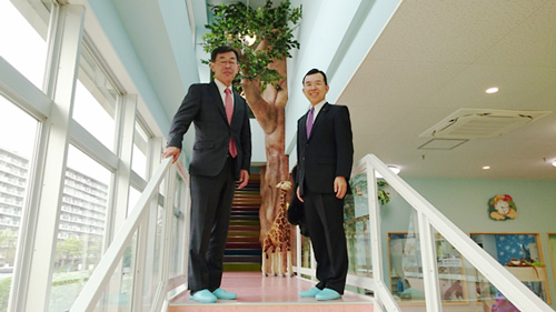 現地の虹の森保育園も視察を視察しました。園内は公園の景観の観点から鉄骨平屋建てにしており、その屋上をプレイグランドとしてゲートボル等に利用ができる人工芝で一般開放をしている。保育所施設内では地域子育て交流サロン専用室で保育園児以外の児童にも利用ができる部屋がある。また、「虹の森」と命名されている如く、明るく虹色を配した部屋や動物のモニュメントが配置されていた。