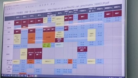 このセミナーでも、午前中に引き続き、様々なエビデンスが示された。どの食べ物ががんに効くか効かないか。がんはどの種類でもステージ4で5年生存率は数%となること。これをステージ1で発見することができれば、6割から9割の生存率になること。早期発見できれば医療費の削減効果に繋がること。しかし、現状のがん検診の受診率は男性死因第1位の肺がんは47%(全国平均)、女性第1位の大腸がんでは35%(全国平均)と、決して高くはない状況であることなど。また、その課題はちょっとした工夫で解決することができることが、他都市の事例をもって示された。